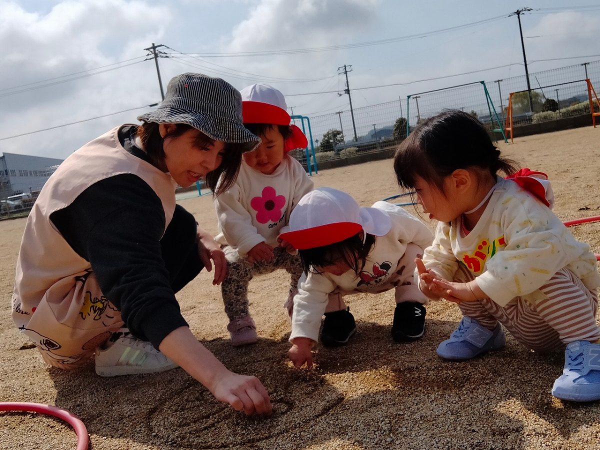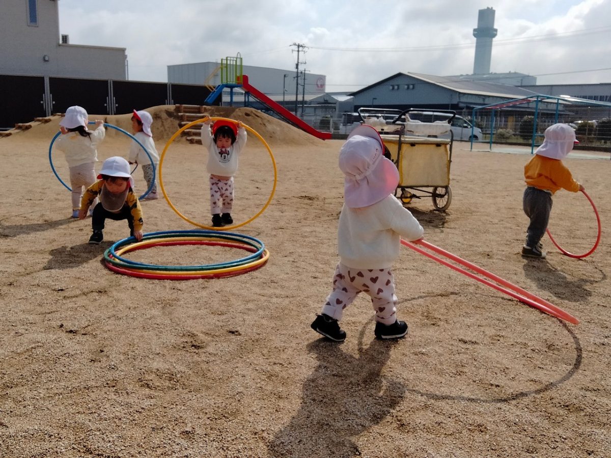 3月23日:園庭でフラフープを持って探検をしたよ(*^▽^*)